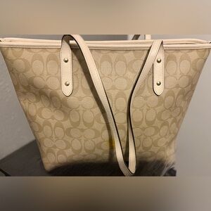 Upgrade your accessory collection with this stylish Coach tote featuring the classic signature pattern. This tote includes sturdy straps and elegant gold-tone details, making it perfect for daily use or travel. It's in like-new condition, with only a small stain on the back that doesn't detract from its fabulous look. Grab this versatile bag today and elevate your style!