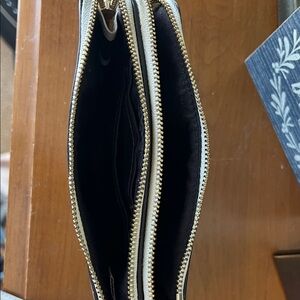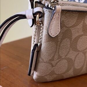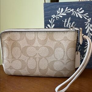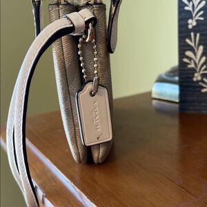 Elegant Coach wristlet in beige. Features iconic logo design.