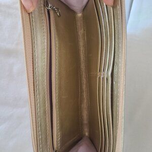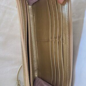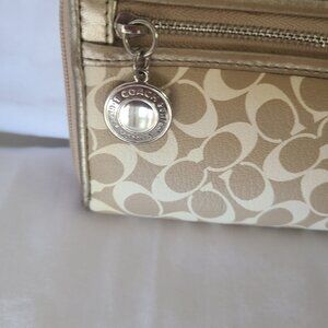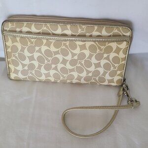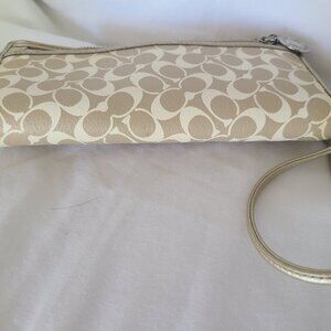 SMOKE-FREE HOME PRELOVED Stylish Coach wristlet wallet in beige with signature pattern. Features a zip pocket and wrist strap. ZIP AROUND WALLET. INTERIOR COMES WITH 8 CREDIT CARD SLOTS ZIPPER COMPARTMENT LENGTH 8 HEIGHT 4 Condition: bag is in great condition.