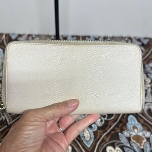 Stylish Coach wallet in beige. Features zip-around closure and exterior pocket. See all photos as they are part of description. Questions welcome