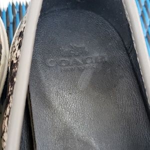 Stylish Coach slip-on loafers. Features a beige textured front with black accents. Comfortable and easy to wear.