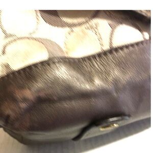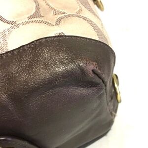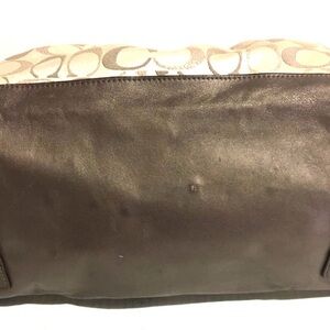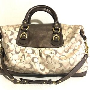 Coach This elegant satchel features a spacious design with a beige body adorned with a subtle circular pattern. The dark brown leather trim and handles add a touch of sophistication, while the detachable shoulder strap offers versatile carrying options. Gold-toned hardware enhances the bag's luxurious appeal, making it a perfect accessory for any occasion. Main compartment 2 pockets at interior wall leather straps & trim lining & exterior have some stains marks hight 6.5” wide 15” depth 4.85” strap drop 4” shoulder strap 12”The dimensions are based on approximately measurements before placing an order please check take a moment to view all photos using feature for a closer look