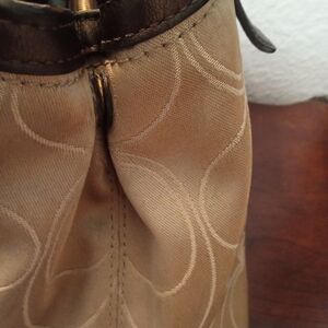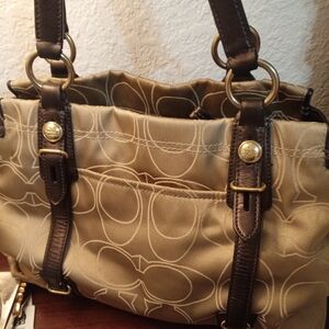 Stylish Coach shoulder bag with signature pattern. Features beige body and brown leather accents. Perfect for everyday use.