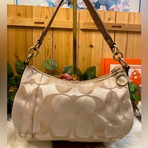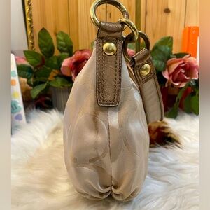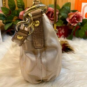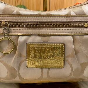 Stylish Coach shoulder bag. Features a beige body with gold accents. Includes front zipper pocket and key ring detail.