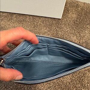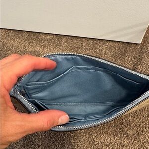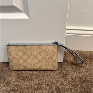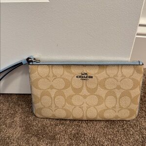 This is a beautiful coach tan and light blue signature logo wristlet. It has card slots inside as well as a few other pockets too. It is in perfect shape with no callouts. It measures 8” x 5”.