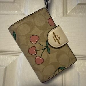 Chic Coach tote with playful cherry design. Ideal for daily use. Matching wallet