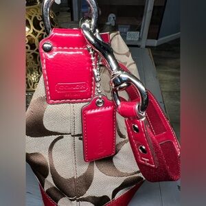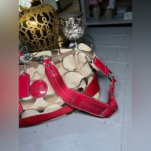 Stylish Coach shoulder bag with bold red accents. Signature canvas design. Perfect for any occasion.