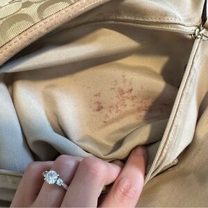 The outside of the bag looks great! (There is a small mark on the outside and the leather by the zipper is flawed in one spot) The inside of the bag has some stains (shown in photos)