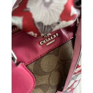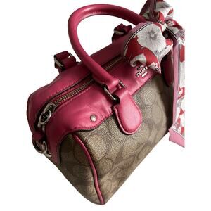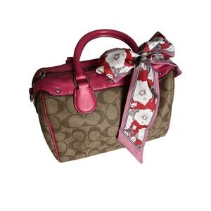 Great used condition, signature C khaki coated canvas with magenta leather details (handles, piping, and top zip area). Silver hardware. Bag is missing strap and hangtag. From 2017, style number F58312.