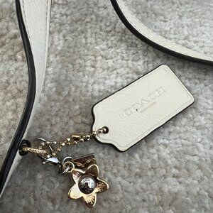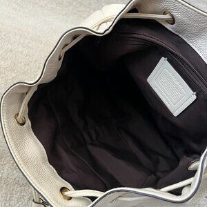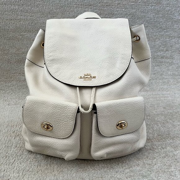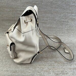 A cream pebble leather backpack with drawstring and magnetic clasp closure and many pockets. Straps are adjustable. Has bag charm design and gold-toned hardware.