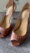 Coach "Billie" peep toe heels in Walnut are a beautiful Cognac/Camel color accented by gold tone mini studs and gold tone hardware, matched stitching, with adjustable buckle, elasticized closure.