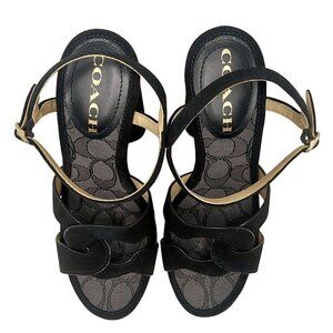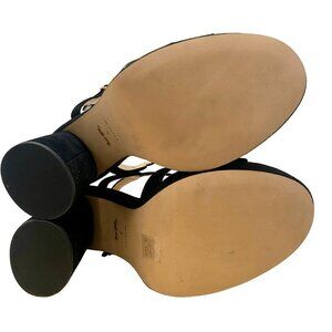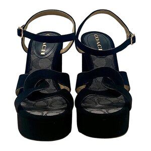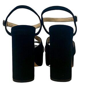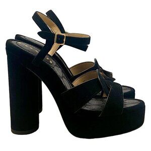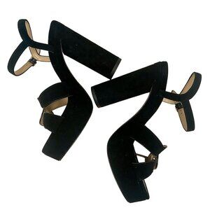 Chic black heels with ankle strap. Features open toe and platform design. Ideal for stylish outings.