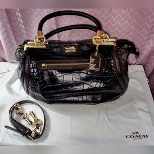 The Coach Black Satchel is a sophisticated accessory crafted from textured leather, featuring a luxurious crocodile pattern. Its structured design is complemented by gold-toned hardware, adding a touch of elegance. With both top handles and a detachable shoulder strap, this bag is perfect for versatile, everyday use.