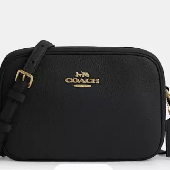 Elegant black crossbody bag with gold accents. Features the Coach logo.