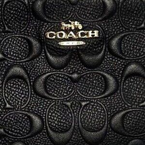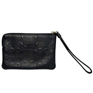 • F67555, coach wristlet, embossed, black wristlet, card slots, wrist strap, zip top, fabric lining, calf leather, embossed logo, coach logo, corner zip,