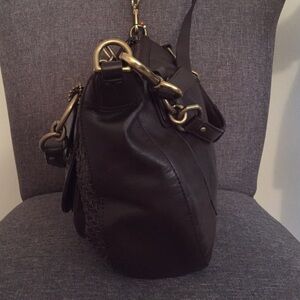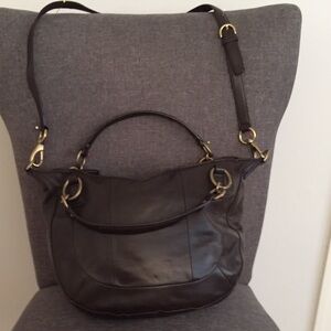 Elegant black crossbody bag. Features gold hardware. Stylish and versatile design.