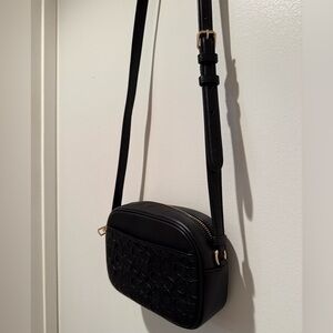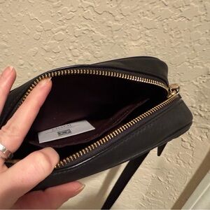 Elegant black crossbody camera bag by Coach. Embossed design with adjustable strap.