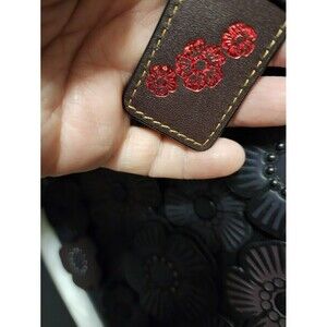 Elegant black satchel with floral design. Features sturdy handles and signature tag.