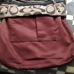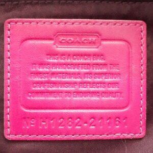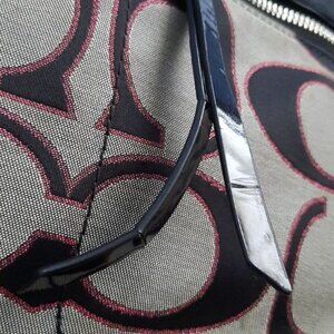 Coach Black Gray Pink Canvas Chain Strap Shoulder Tote Handbag No H1282-21161. Front outside zipper. Snap closure. Inside zipper pocket. 2 inside open pockets. Outer corners have wear & some discoloration. Leather handles have wears. Inside pocket has stains. See all photos above. Questions and offers welcome.