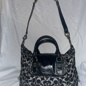 Coach Black Gray Signature C Satchel Tote Purse Patent Leather Trim Shoulder Bag