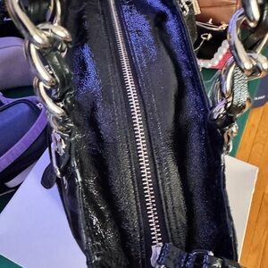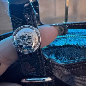 Stylish Coach tote with signature pattern. Features chain and leather handles. Ideal for daily use.