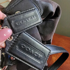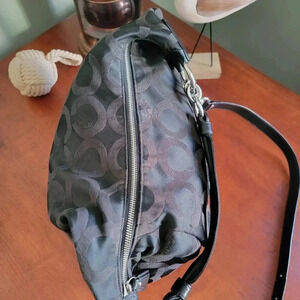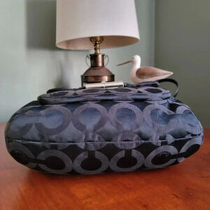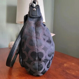 Coach Black Kristen Op Art Hobo in black Signature jacquard and black leather is Coach style 16811. Made in 2010, she's oversized, super roomy and slouchy. Has a wide black leather carry/shoulder strap, and removable longer shoulder strap. Silver-tone hardware and double hangtag.