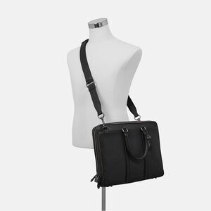 This sophisticated Coach briefcase in black leather combines timeless elegance with modern functionality. Featuring a structured design and a detachable shoulder strap, it's perfect for professional settings. The high-quality craftsmanship ensures durability and style.