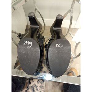 • Coach Black Leather Buckle Slip on Clogs Open Heel 3 1/2in Heel Leather Buckle on Top Coach Print on Fabric Silver Studs on Sole.