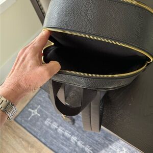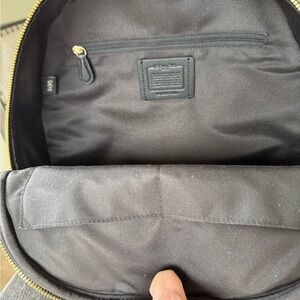 Elevate your style with the Coach Black Leather Backpack. Crafted for durability and elegance, this backpack is perfect for everyday use. Two slip and one zip pocket on main interior. Laptop section in back. Larger pocket on front plus two side pockets for water bottle or umbrella.