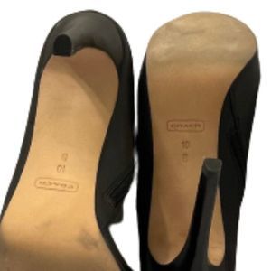Look at these beautiful boots by Coach. The boots feature: Silver turn lock hardware, Inside zip closure, Stacked 4.25” heel, Original box included