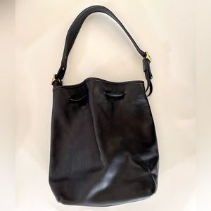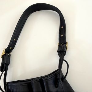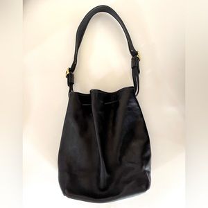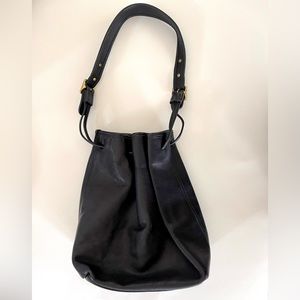 Elegant black leather hobo bag. Features adjustable strap and gold-tone buckle. Perfect for everyday use.