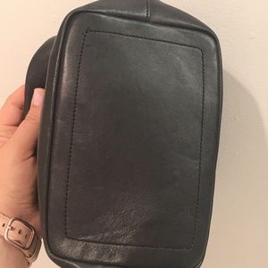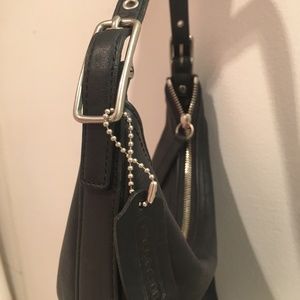 Authentic Coach black leather Legacy West hobo handbag (Style 9823). Features silver-tone hardware, an adjustable black leather shoulder strap (9" max), a signature Coach hang tag, and a top zipper closure with a black leather zipper pull. Interior of handbag is fully-lined in signature Coach brown canvas fabric with a single side zipper pocket, a side patch pocket, and a side cell phone/accessory pocket. Made in China.