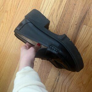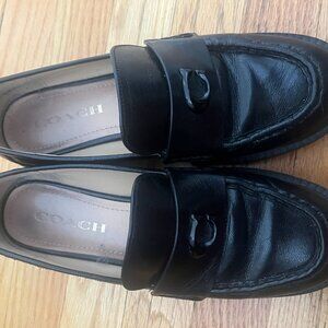 Sleek black leather loafers. Features signature logo detail. Comfortable and stylish design.