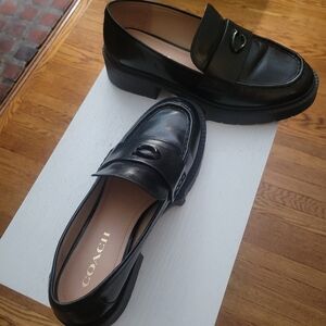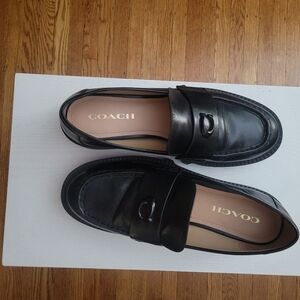 Elegant black leather loafers. Features signature Coach logo. Comfortable and stylish.