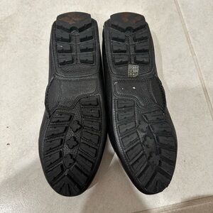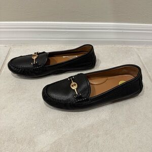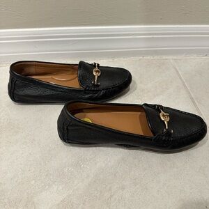 Sleek black leather loafers with a chic gold detail. Ideal for a polished look. These can be dressed up with pants or more casual with distressed denim. Anyway you style these you will love them! Overall excellent condition with no major signs of wear. Markings on back/bottom rubber
