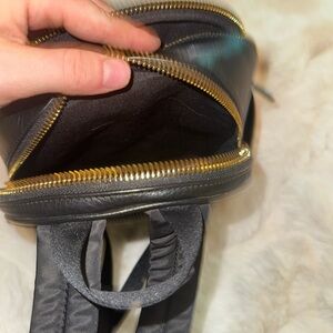 Elegant black leather backpack. Features gold hardware and adjustable straps.