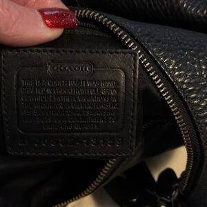 Chic black leather mini bag by Coach. Features a front zipper pocket and adjustable strap. Ideal for stylish outings.
