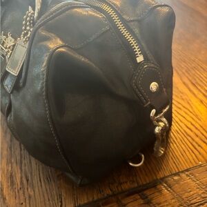 Chic Coach satchel in black leather. Features silver hardware and iconic logo charm. Perfect for everyday elegance. No long strap