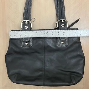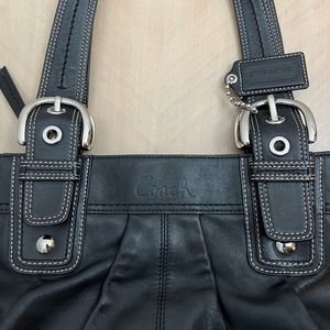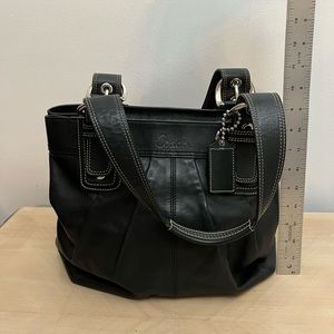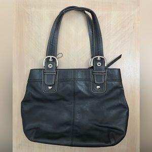 Elegant black leather shoulder bag. Features silver hardware. Perfect for any occasion.