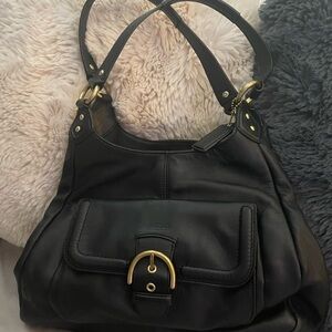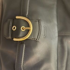 Sleek black leather design. Features gold hardware. This bag definitely will fool you with how much she can hold. Features 2 deep pockets secured with zipper and snap. Pockets are very deep. This bag is in exceptional condition.