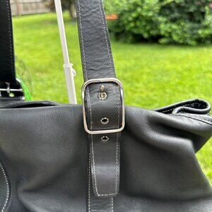 Coach 7582 black leather satchel features a slouchy, expandable shape with contrast stitching, dual-buckle shoulder straps, and the original leather hangtag. This versatile bag works equally well as a classic everyday tote, carry-on travel bag, or spacious shopper/diaper bag.