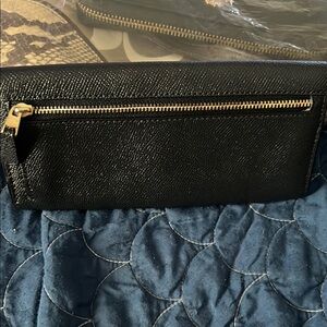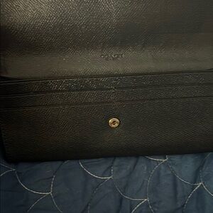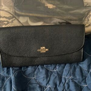 Elegant navy blue leather wallet by Coach. Features a sleek design with a gold logo accent.