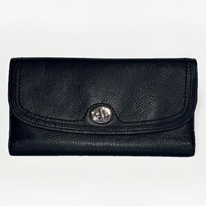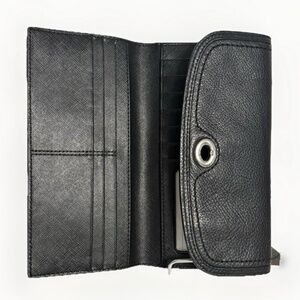 Elegant black leather wallet. Features silver-tone clasp. Sleek and stylish design.