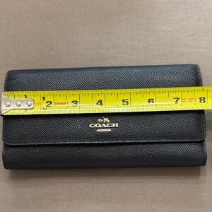 Sleek black leather wallet by Coach. Features a gold logo accent, outside slip compartment, many interior pockets to help you stay organized and a detachable ID tag on chain (see photos). Perfect for any occasion. Excellent used condition. Smoke-free home. Does NOT include dust bag.