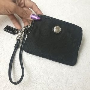 Coach black leather wristlet featuring a buckle detail with front pocket and zip. Perfect for carrying essentials.