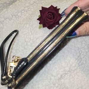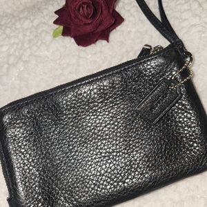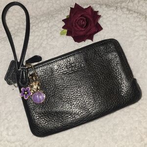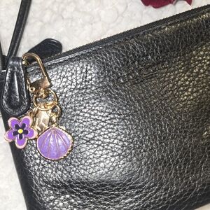 Elegant black leather wristlet. Features a purple charm. Perfect for any occasion.