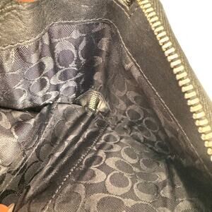 Vintage Classic Coach black leather compact wallet with silver-tone zipper and detailed contrast stitching. Features multiple card slots, ID window, bill section, and a coin pocket with signature Coach fabric lining.