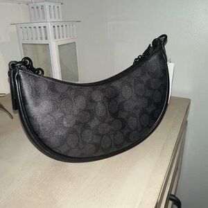 The Coach Black Crescent Chain Shoulder Bag is a stylish accessory that combines modern design with classic elegance. Crafted in a sleek black monogram canvas, it features a distinctive crescent shape and a bold chain strap for a contemporary edge. This versatile bag is perfect for adding a touch of sophistication to any outfit. Timeless and sleek, the Coach Black Signature Coated Canvas Mira Shoulder Bag CQ764 effortlessly combines classic elegance with everyday functionality.