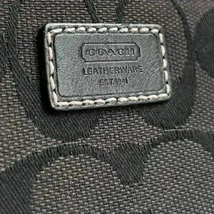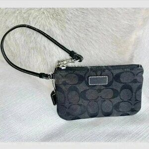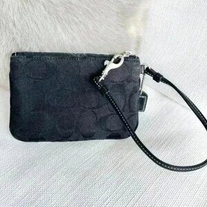 Keywords: Coach wristlet wallet, black leather wristlet, Coach monogram pouch, small designer bag, Coach accessory, jacquard Coach wallet, women's travel clutch, compact leather wallet
