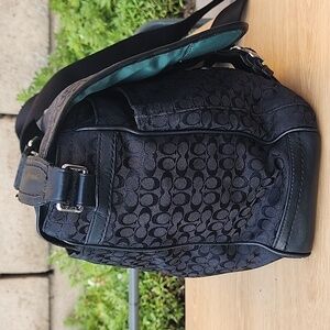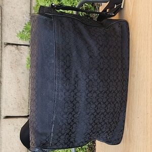 Coach Black Monogram Messenger Bag fits a laptop and plenty of room for other devices and documents. Silver hardware, adjustable strap, magnetic closure and clean Emerald green interior.
